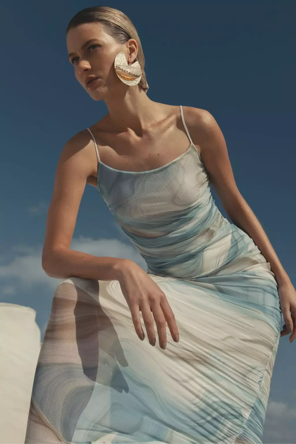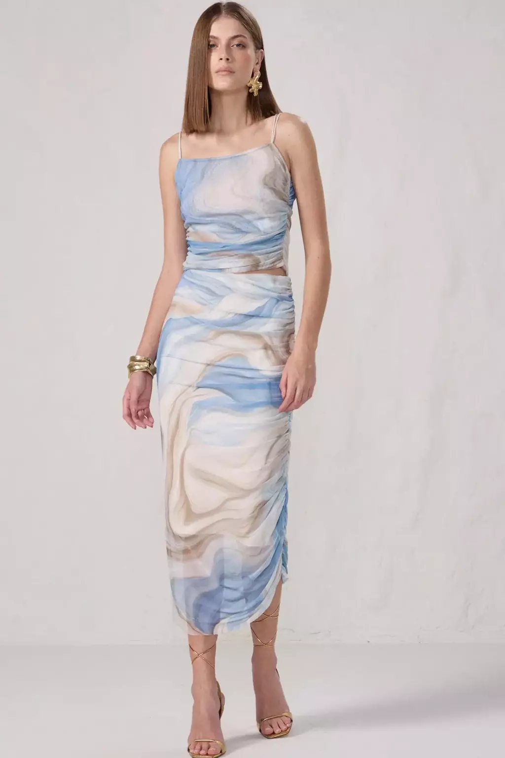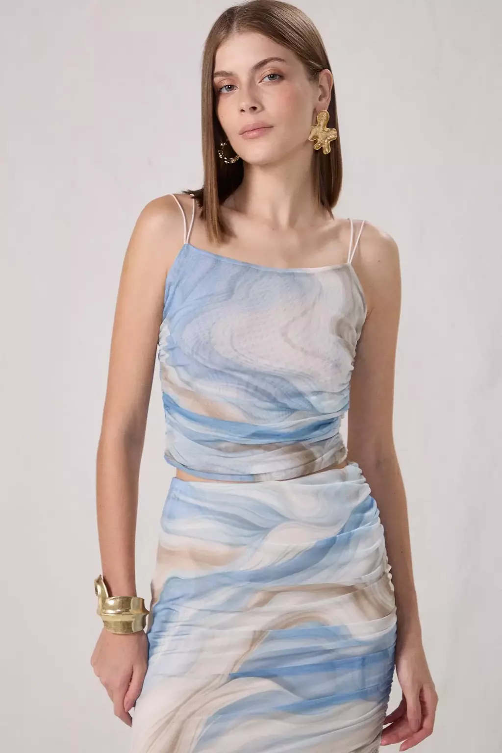 Saia midi com leve franzimento nas laterais em tule sublimado estampado.